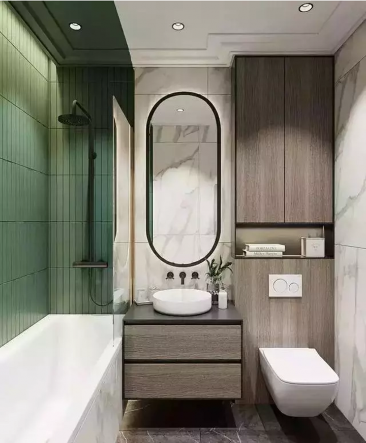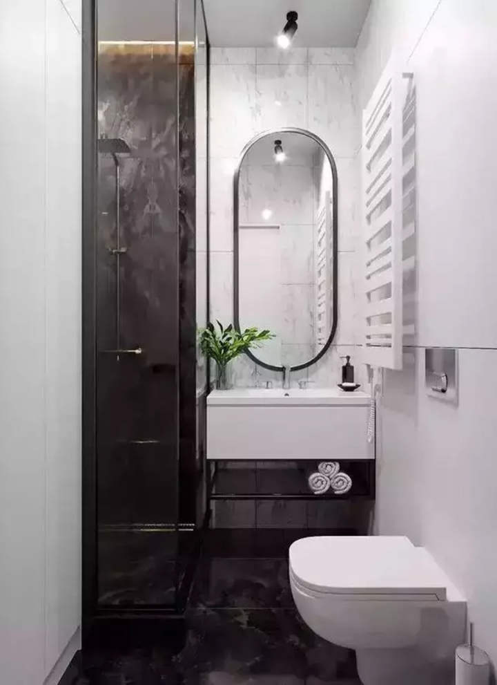 洗漱區的核心角色是洗臉臺,洗臉臺的上方、下方是把東西“藏起來”的好地方。一般而言,上方都會安裝便于梳洗的鏡子,我們可以用鏡面柜取代鏡子,一物兩用,利用率更高。
