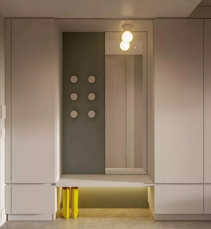 鏡子嵌入到墻壁中一直頂到天花,有放大空間的效果,換鞋凳上方設置一些衣帽鉤,方便進門時換下外套掛起來。