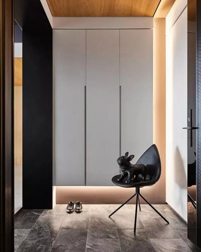上面這款玄關柜頂天立地,充滿整個狹長走道,底部的留空很長,設計之初一定要預留電線,設長燈帶,方便今后找鞋。