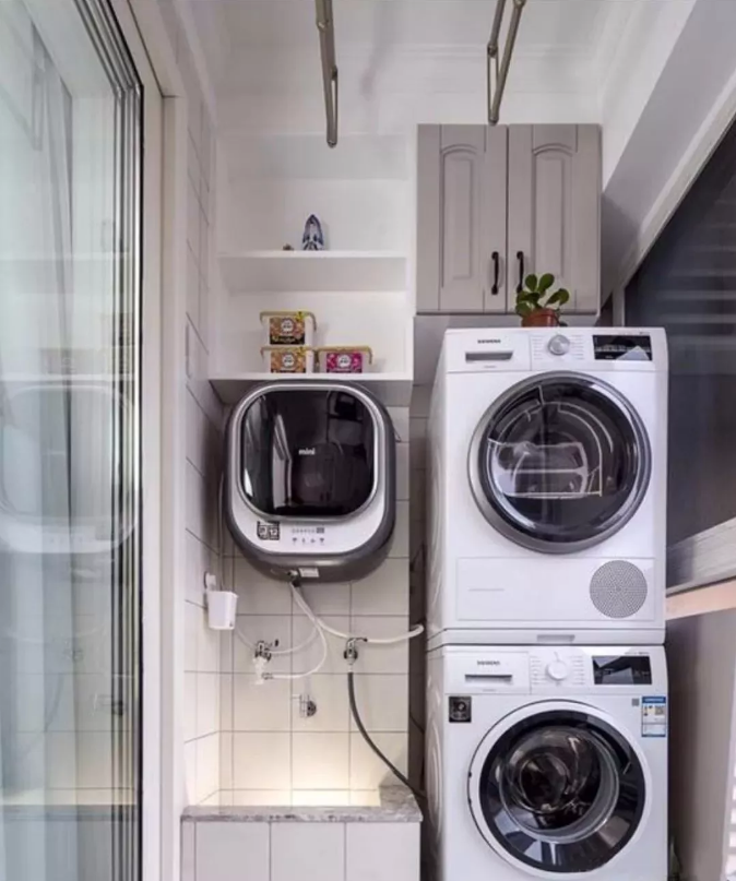 陽臺的其中一側(cè)空間被充分的利用起來,洗衣機(jī)、烘干機(jī)疊在一起擺放,洗手臺的上方還有這一個(gè)嬰兒洗衣機(jī),上方同樣有著吊柜。