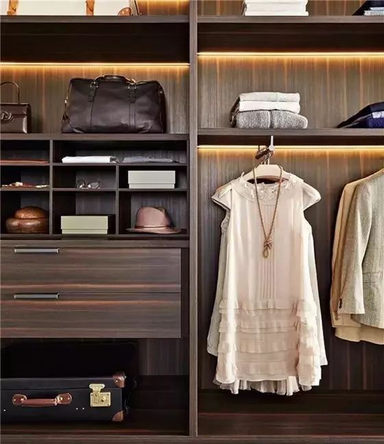 年輕夫婦的衣物是多樣化的,一般將左右兩邊分別設置成男女方各自的儲衣空間,柜體內的掛衣架通常分為長短兩層分別儲存大衣和上裝,襯衫也可以放置于獨立的小抽屜或擱板,不會因過多衣物擠壓在一起而皺折難看。