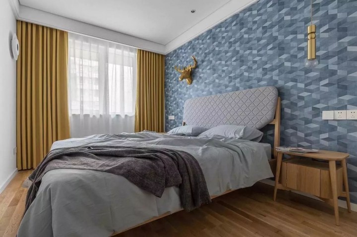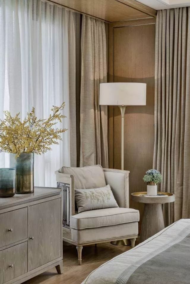 色彩方面不宜大面積的使用高飽和和高對比的顏色,面料盡量選擇厚實有質感并且遮光效果好的,如果單層布料不能滿足遮光要求,加上一層襯布不僅可以提升遮光效果 同時還具備保溫隔音的效果,有效提升房間的舒適度。