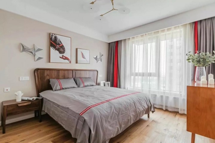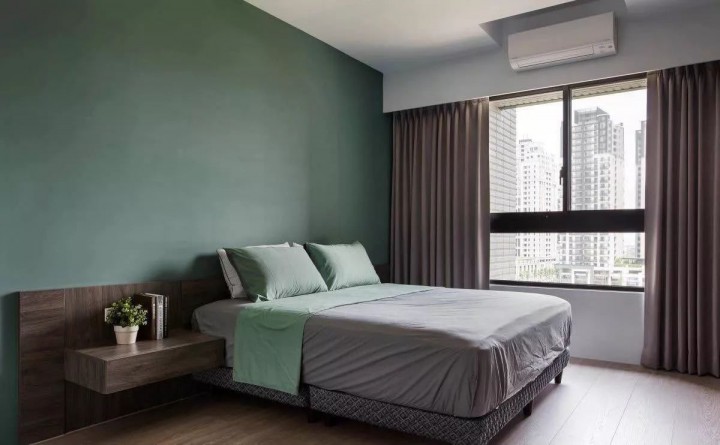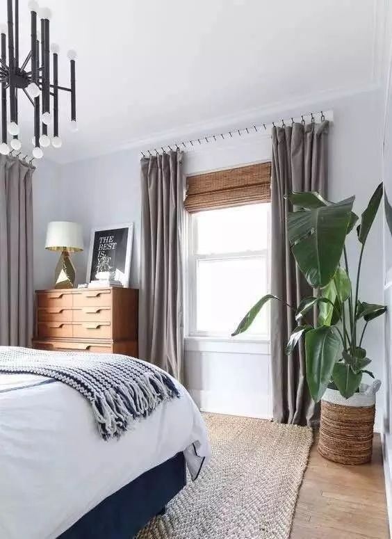 臥室的窗簾更注重功能性,要充分避光以保證睡眠。臥室內窗簾最好選擇落地款,以免窗簾過短而漏光。