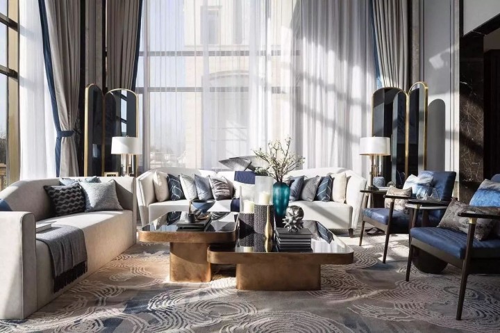窗簾色調應與家具及飾品協調搭配,營造和而不同的層次感,注重面料的質感與垂感,這樣就可以營造出一種莊重簡潔、大方明亮的視覺效果。