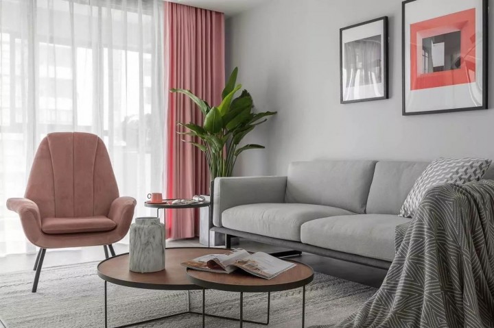 窗簾的粉紅既不花哨又不會單調無趣,且與灰色沙發、木紋茶幾融成一個十分和諧的視覺整體。