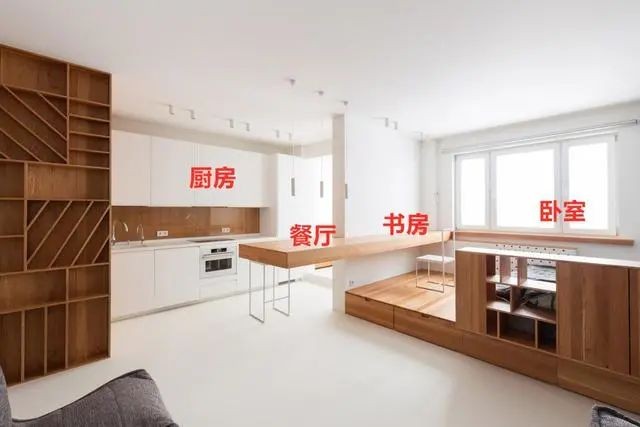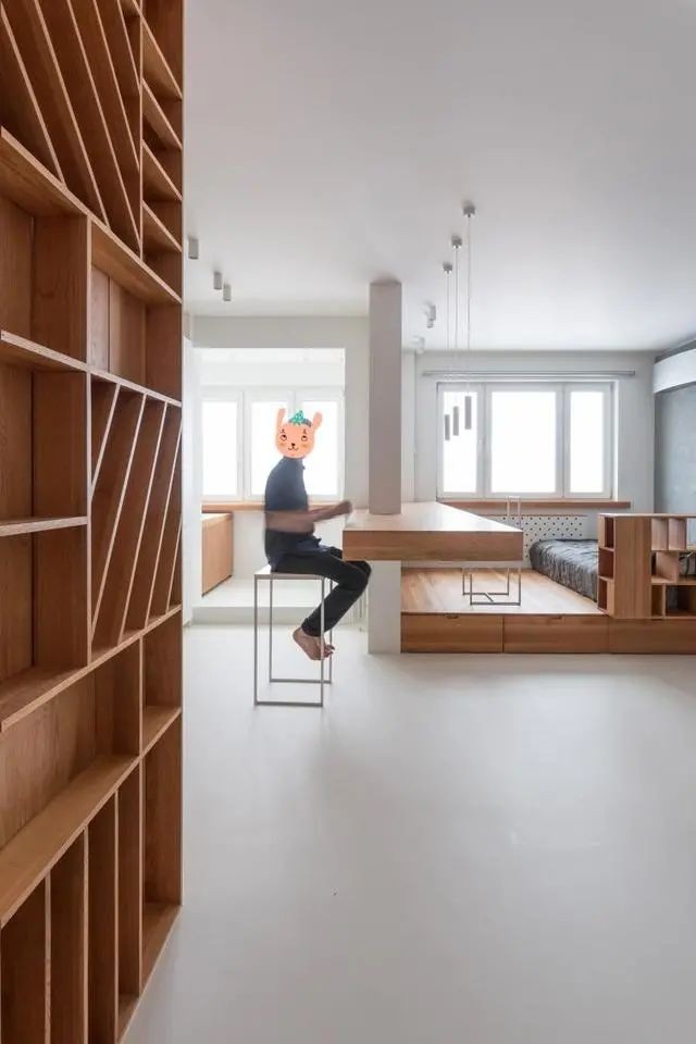 同樣的一面承重墻,加了一圈木制臺面,把沒用承重墻轉變成有用的隔斷墻,實現兩大空間的四個功能,小戶型這樣設計可以節省出很多的空間。