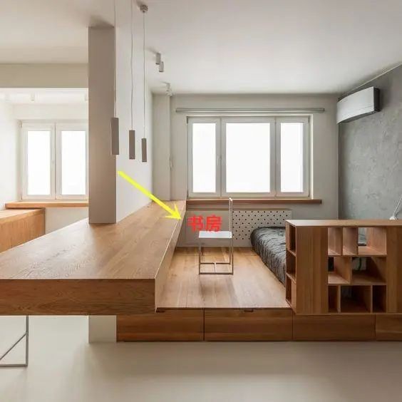 另一邊靠臥室的這一側臺面可以當書桌來用,把地面抬高50公分做成地臺床,臥室也不需要砌墻隔斷。