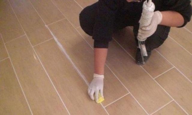 3、打膠,將美縫劑放在液壓槍里,然后槍嘴對著需要美縫的瓷磚縫隙打膠就行,切記打膠的時候,膠一定要飽滿。