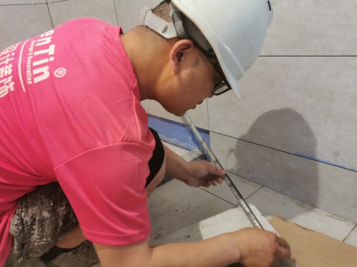 在施工里魏師傅和戴姐專門負責貼磚,夫妻之間的默契讓他們的工作流程十分流暢,戴姐負責核對尺寸、切割材料,魏師傅負責拼貼,整個流程行云流水一氣呵成,效率和品質(zhì)都非常高。