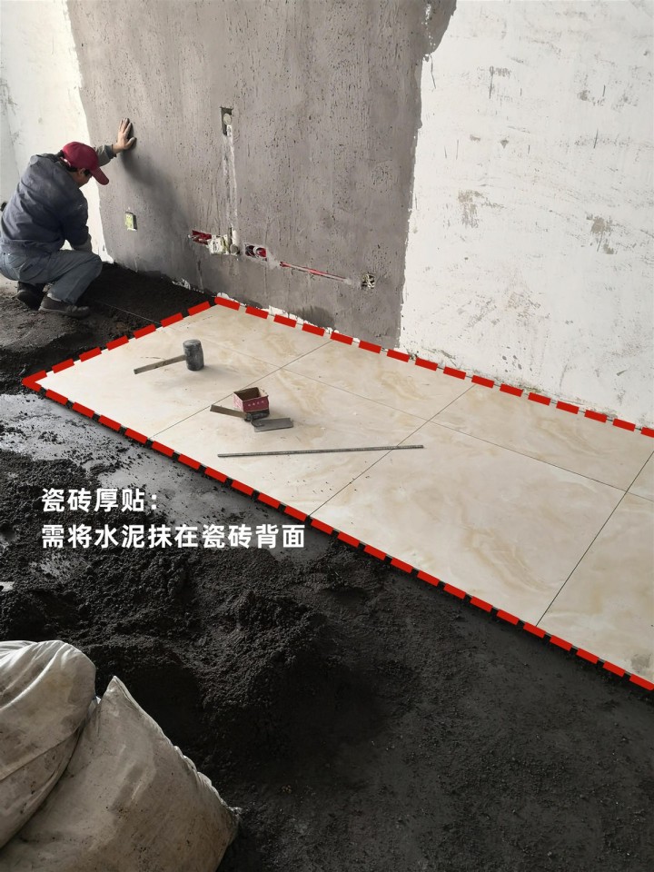 瓷磚厚貼是比較傳統的的鋪貼方式,主要就是將有一定比例的水泥抹在瓷磚背面,然后再貼到墻面上,充當黏合劑的作用。