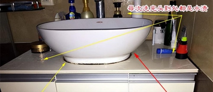 2、臺下盆雖然安裝方便,也很安全好看,但是每次洗漱完臺面周圍都會有一圈水漬,不好處理。且使用衛生有死角,清理起來特別麻煩。臺盆下面的玻璃膠遇水容易發黑,影響整體美觀。