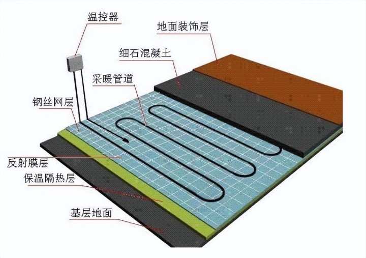 濕式水暖是先鋪2cm保溫層,再鋪反射膜,水管,然后蓋上鋼絲網(wǎng),回填,回填層大概3cm,整個地暖層的厚度算下來就5cm。濕式電暖可以更薄一些,4cm左右。