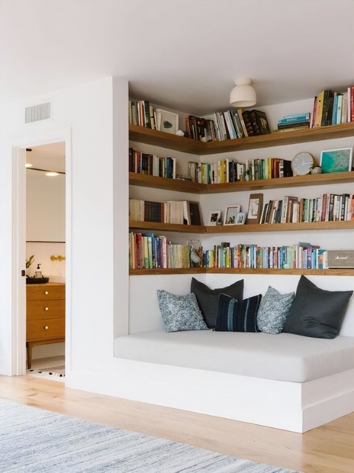 墻面轉(zhuǎn)角大多閑置,因地制宜打上書架,開放式還是封閉式,隨你自己喜歡就好,只不過要注意下邊角的磕碰,可考慮適當(dāng)改弧形。