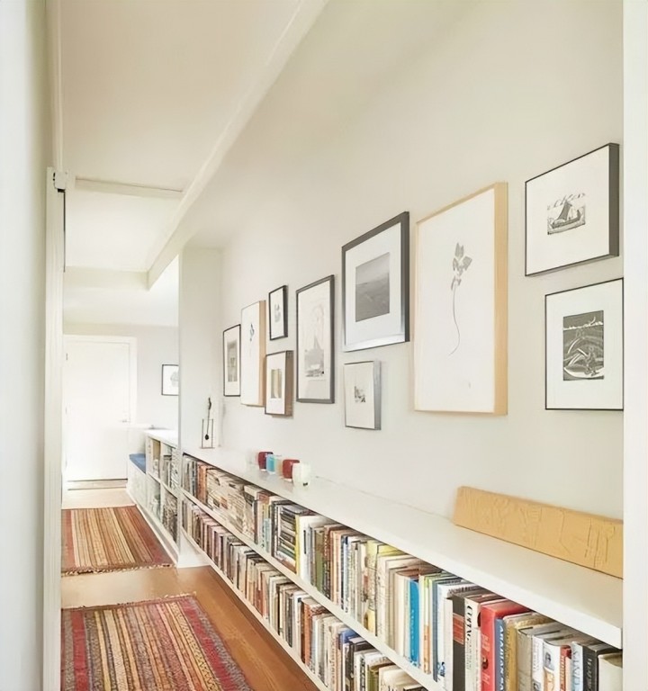 如果你家是長走廊的戶型,兩邊的墻面都是不可多得的收納區(qū),更不能忽略,用來為孩子打造閱讀區(qū)是再好不過的。