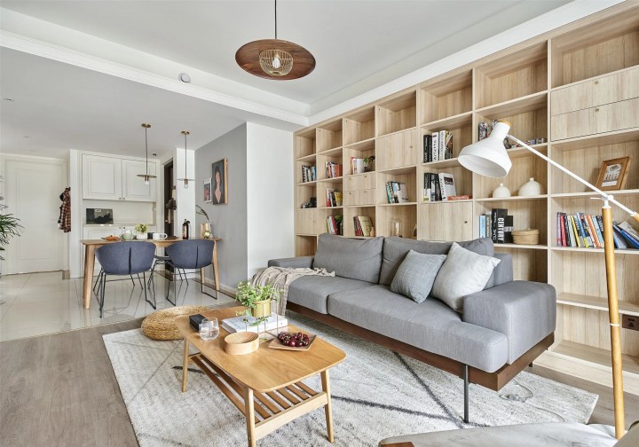沙發(fā)后定制整面收納柜,局部留空設(shè)計(jì)開放式書柜,不僅在很大程度上增加了收納空間,在沙發(fā)上休息的時(shí)候伸手就能拿書看,也很方便。