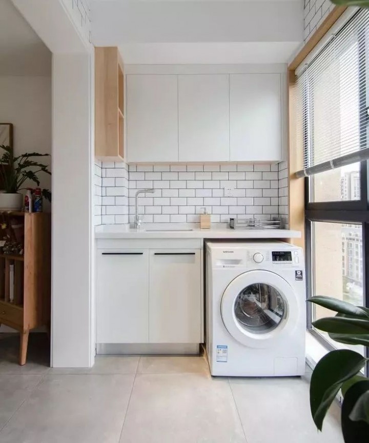 陽臺的空間別浪費,在陽臺放置洗衣機,打個柜子能幫著放一些東西,我們在這里洗完衣服以后就可以直接在陽臺晾曬,也是非常的方便實用。大家在裝修時,一定要記得在陽臺上留下上水管和下水管,不管用著用不著,先安裝上,要不然以后太不方便了。