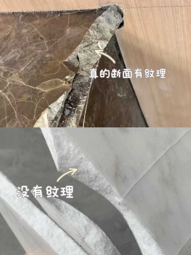 這里需要注意:①甄別大理石真假:通過看大理石斷面巖石細密程度,真的大理石斷面是富有紋理的;