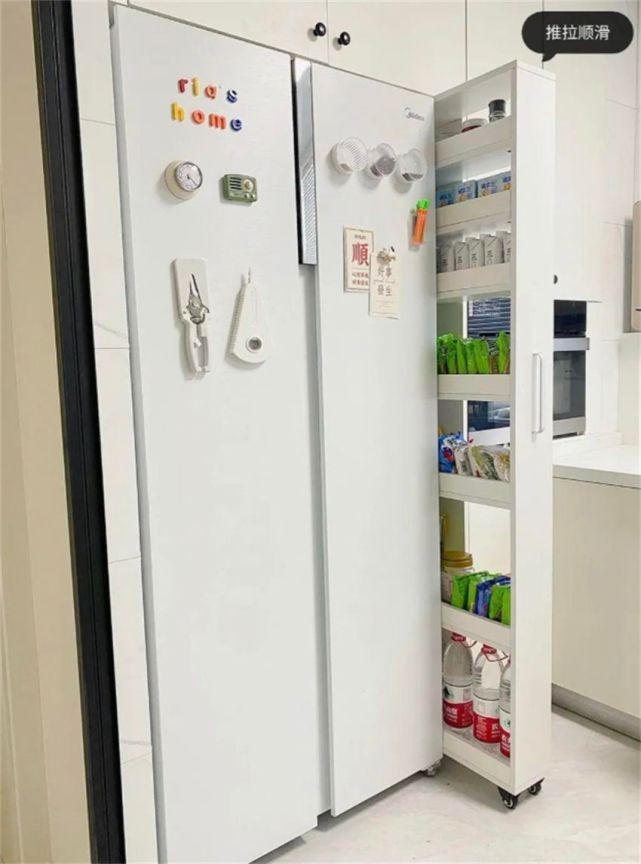 冰箱靠墻放或者靠柜子放,旁側總會留有一個小縫隙,與其空著不如利用上,定制10-15cm抽拉柜擺放在側邊,既不突兀又便捷使用,儲物容量瞬間翻倍。