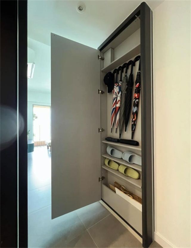 門后15CM(大概兩指之間的距離)打薄柜,雖然空間不算大,但收納零散的日用品綽綽有余。比如在臥室門后空隙處就足夠做一個窄柜,收納薄衣服、鞋子、帽子圍巾領帶等飾物剛好。