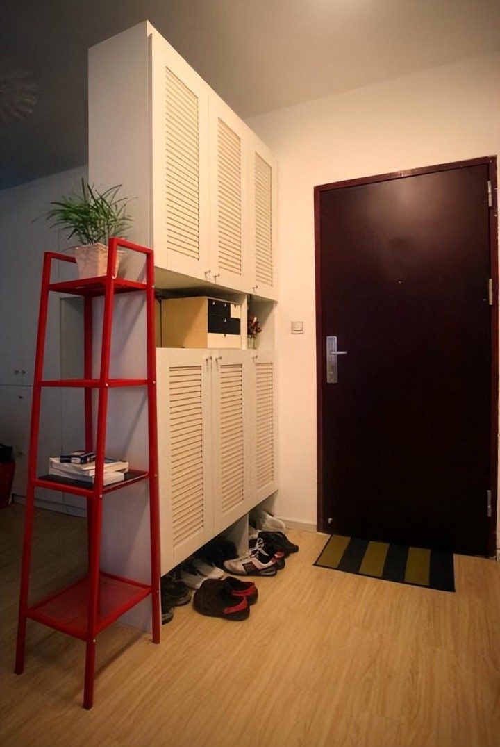 對于空間有限的家庭來說,靠墻放置鞋柜最實用。像上面的例子一樣。至于隱私性,可以選擇給入戶門掛一個簾子。