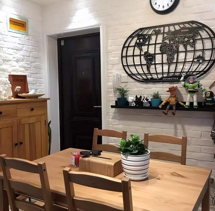 比如下圖,屬于無玄關的第一種情況,垂直于入戶門,放一個鞋柜,自造一段假走廊。靠墻的這邊可以掛鏡子、釘衣鉤,放穿鞋凳。鞋柜后面是餐廳,剛好可以起到一定的隔斷和緩沖作用。