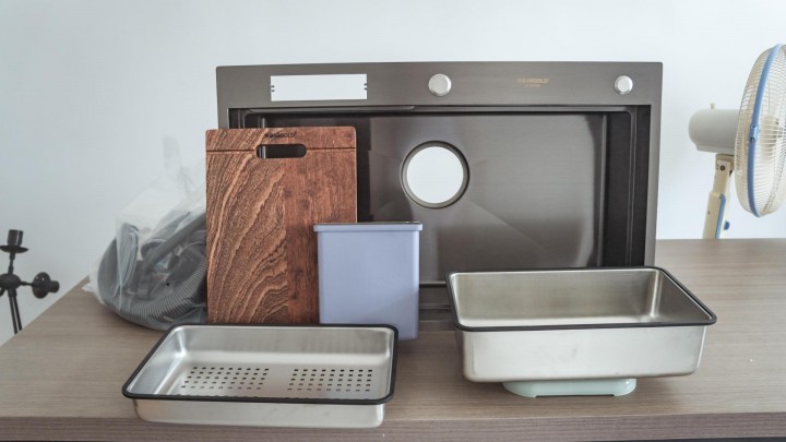 雙階梯結構是我第一次接觸,砧板和另外兩個水盆位于不同高度放置可以做到互不干擾,進一步節約了臺面空間,同時這一趟也可以讓這個龐大的單槽變身雙槽,可以根據自己的需求進行搭配使用。