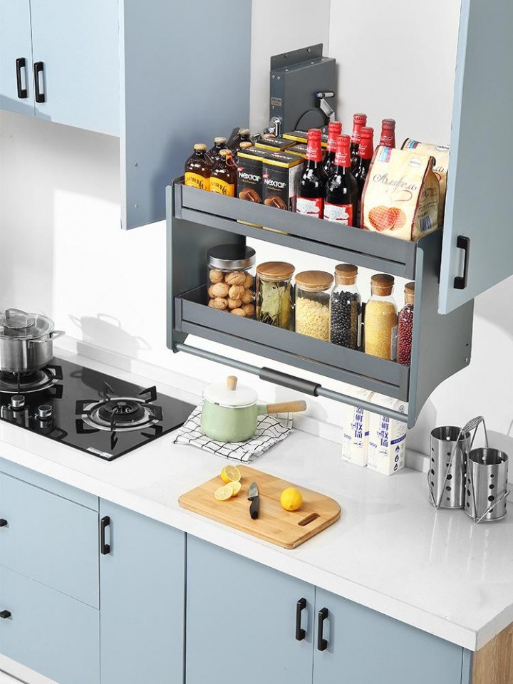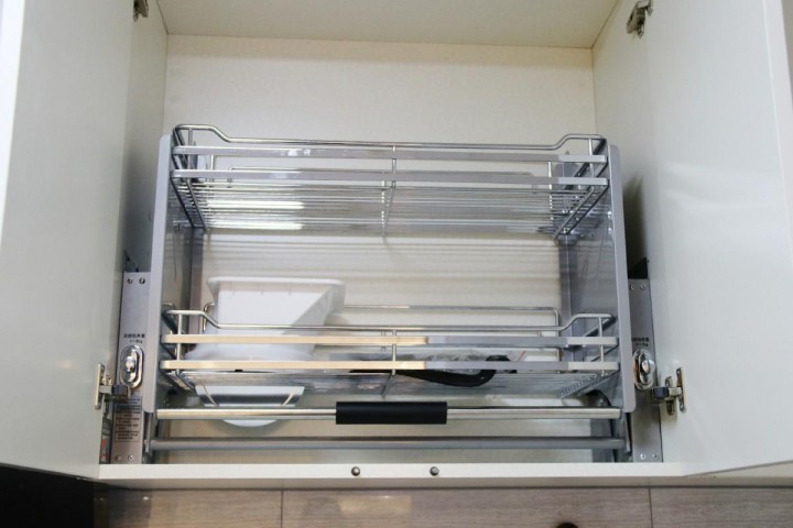 不知道大家有沒有看過升降籃筐的介紹視頻。你只需要用手輕輕一拉,掛柜里裝滿食物的提籃就會慢慢降下來,用完后輕輕一推,提籃就會平穩回升。