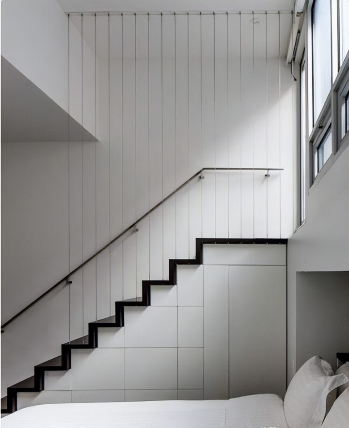 跟上面有異曲同工之妙,將用來封陽臺的隱性防護網用在室內,代替樓梯扶手起到基本的保障作用,只不過實際操作時,要注意中間的間距,這點是需要提前確定好的。