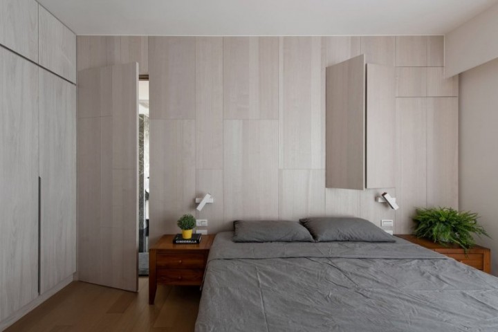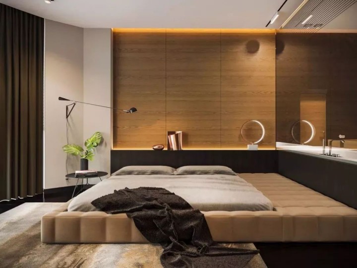 床頭設計護墻是很常見的,整面木質護墻不僅有著很好的隔音效果,更能營造出安靜的睡眠氛圍。