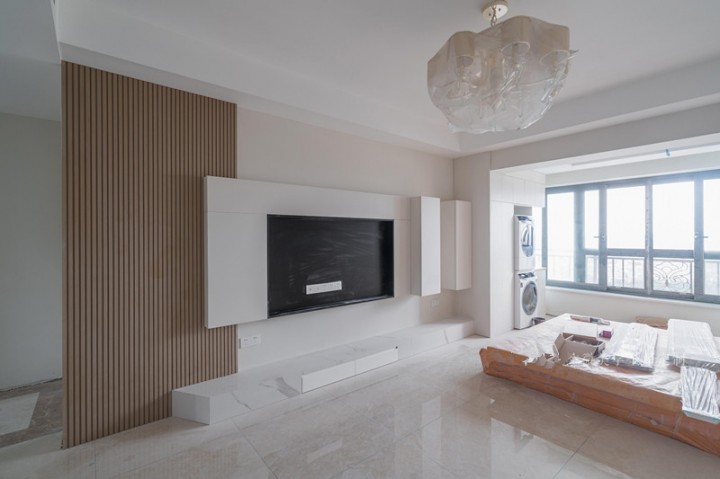電視背景墻旁邊有個門,不如選擇護墻+隱形門的一體化設計讓客廳更顯干凈、利落,能從視覺上擴大空間的面積感。