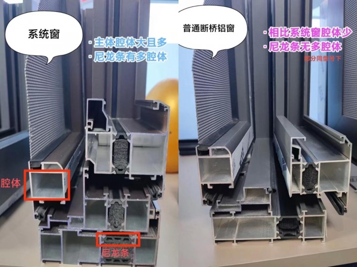 實際上這兩者有著顯著的區別。因為斷橋鋁窗戶,雖然型材也是鋁材,但是其結構是兩腔體,而系統窗是由鋁材組成的多腔體結構。拋開密封條、隔熱條以及鋁條等諸多材質,單純“多腔體”的結構本身就具備明顯的優勢,比如隔音性更好、保溫性更好等等。