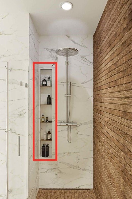 衛(wèi)生間的轉(zhuǎn)角常見的做法,若是比較靠近淋浴區(qū)的話,可以做一個壁龕,深度合適,用于一些淋浴用品的放置,拿取格外方便。靠近洗漱臺的話,空間不大的話,可以選擇做成“窄柜”。