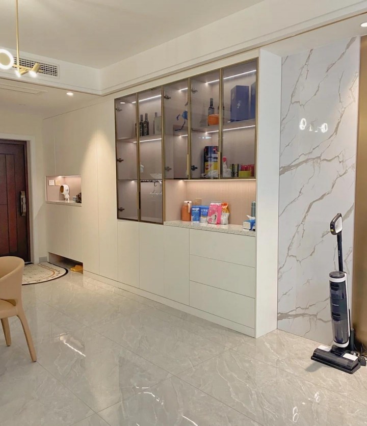 定制的餐柜與鞋柜融為一體,儲物空間非常大。上部主要由玻璃門制成,用作酒柜?;疑牟A渖蠠魩?,檔次感立刻提升,很好地凸顯了出來。根據業主的品味和風格,適合在中間空間放置一些小家電,以緩解廚房的壓力。