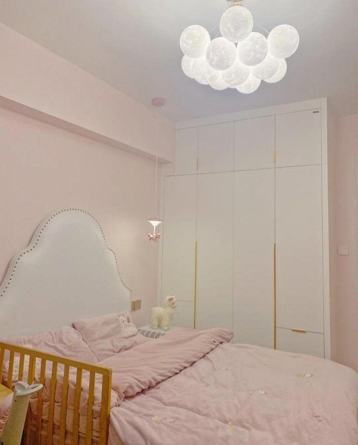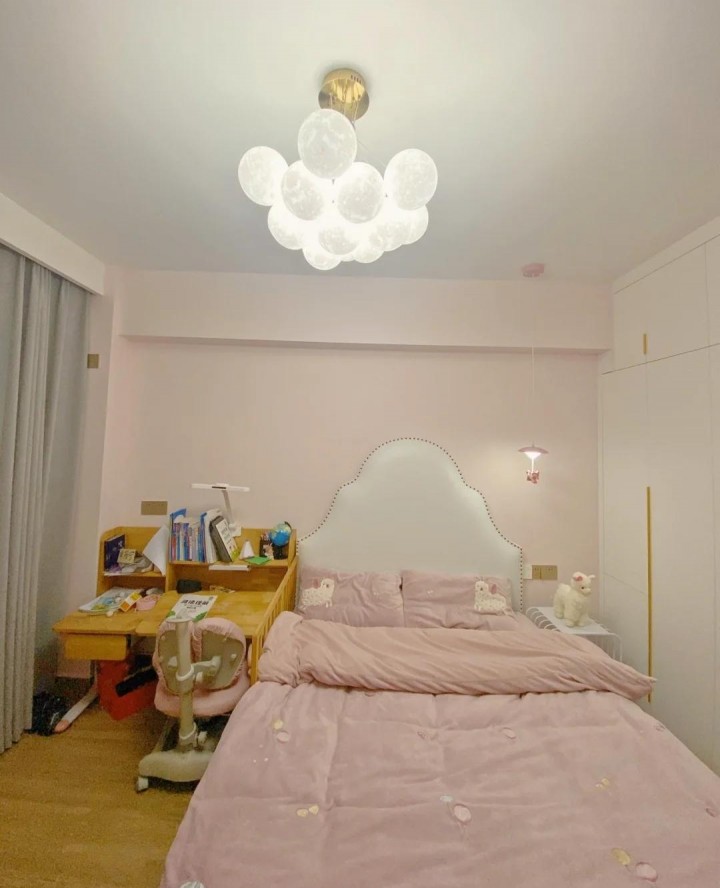 兒童房的背景墻涂上了粉色乳膠漆,營造出一種充滿少女的氛圍。右側配有實木兒童書桌。材料安全環保。同時,可調節性可根據不同年齡段孩子的需求進行調節。更實用。