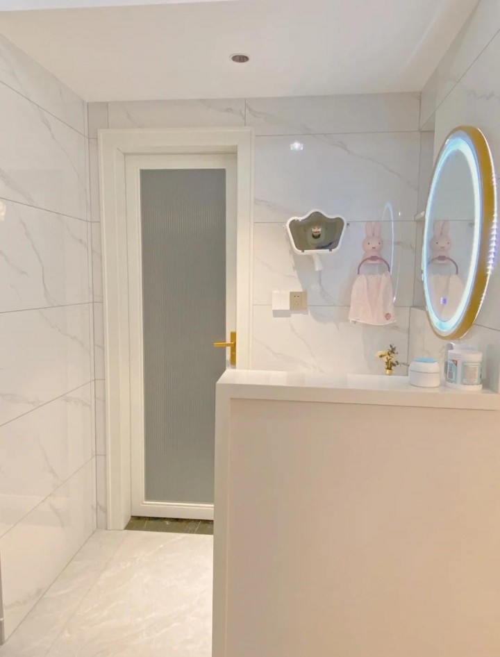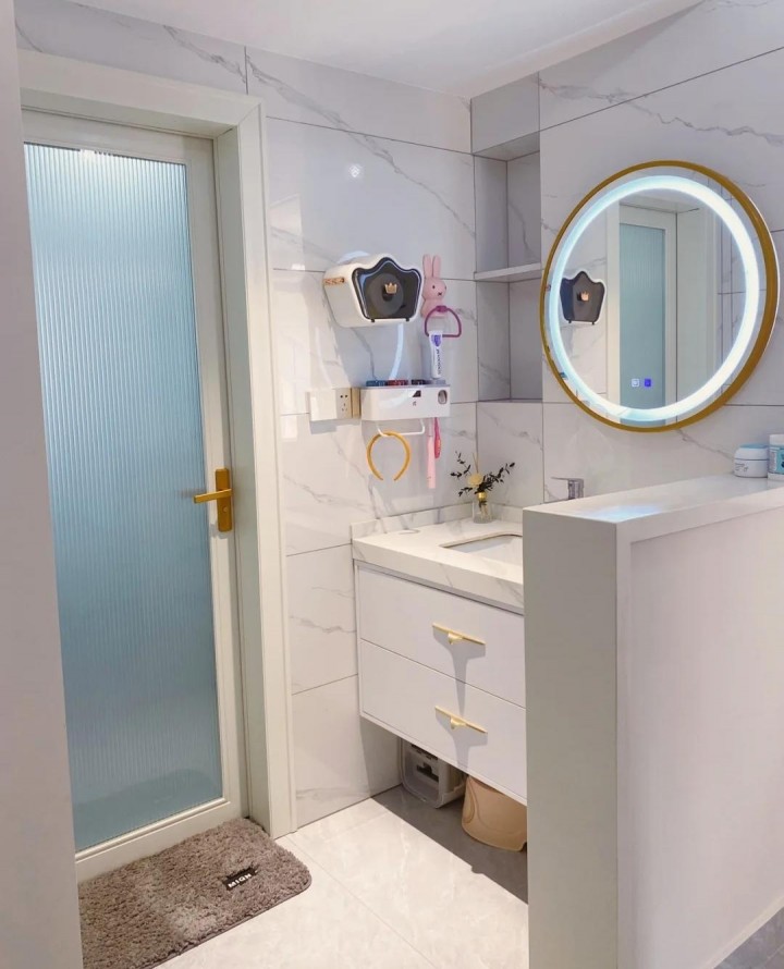 衛生間的干區向外移動,從外部采用半墻隔斷設計,保持干區的透明性。同時,半墻臺面也可用于收納,實用性更強。