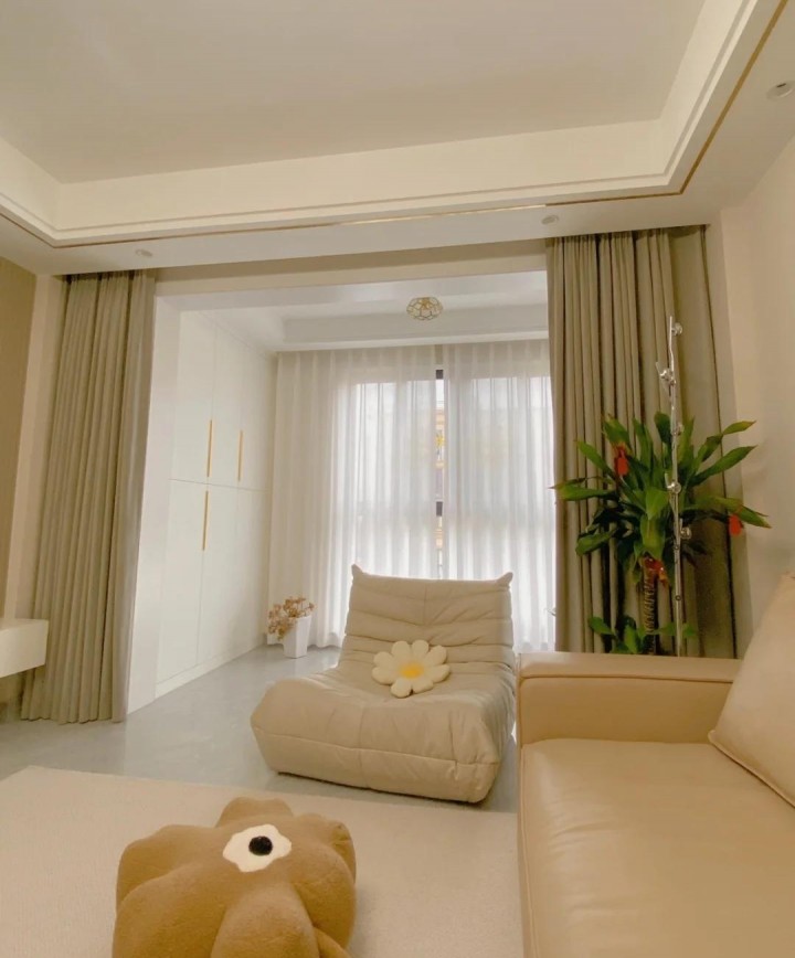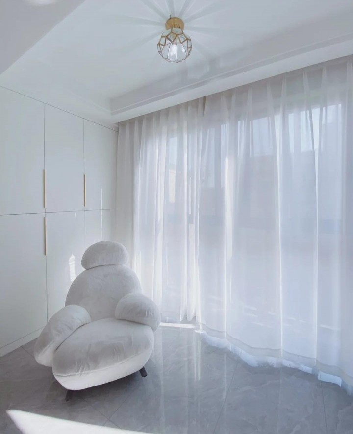 落地窗配上白紗窗簾,營造出一種飄飄欲仙的感覺。朦朧的光影,讓現場氣氛更加浪漫愜意。論是設計為休閑區還是學習區,都是一種輕松舒適的存在。