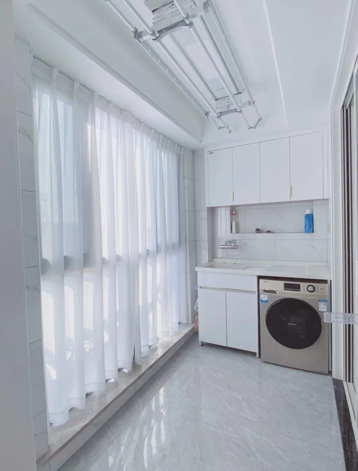 天花板上設計了隱形晾衣架,平時肉眼看不見,讓陽臺很融為一體,美觀實用。