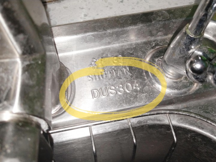 ①材質上,僅僅是“不銹鋼”還不行,一定要選“304不銹鋼”。此外,有些水槽上標注著“304”,卻未必是304不銹鋼。比如下面這個水槽,寫的是“DUS304”▽