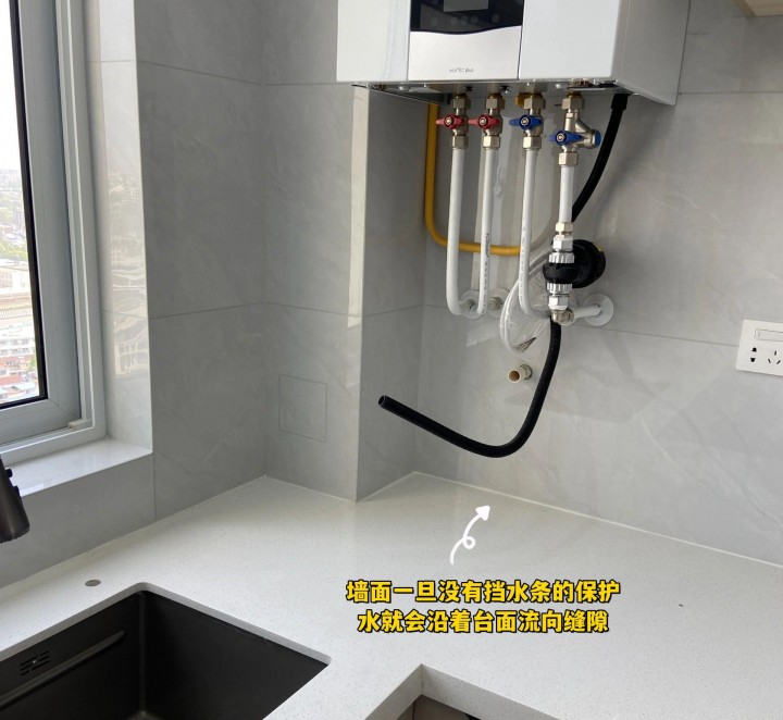墻面一旦沒有擋水條的保護,水就會沿著臺面流向縫隙,時間久了,玻璃膠便會出現受潮發霉變黑的情況,甚至會面臨脫膠、漏水的問題。