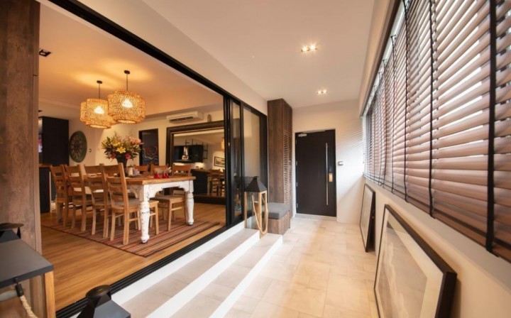 同樣的延伸,室內一面再增加一道玻璃墻,與玄關的這道墻面,讓這區(qū)域形成一個單間。可以根據需求,布置我們說需要的功能。除卻入戶花園之外,像是入住儲物間、餐廳等等即可。