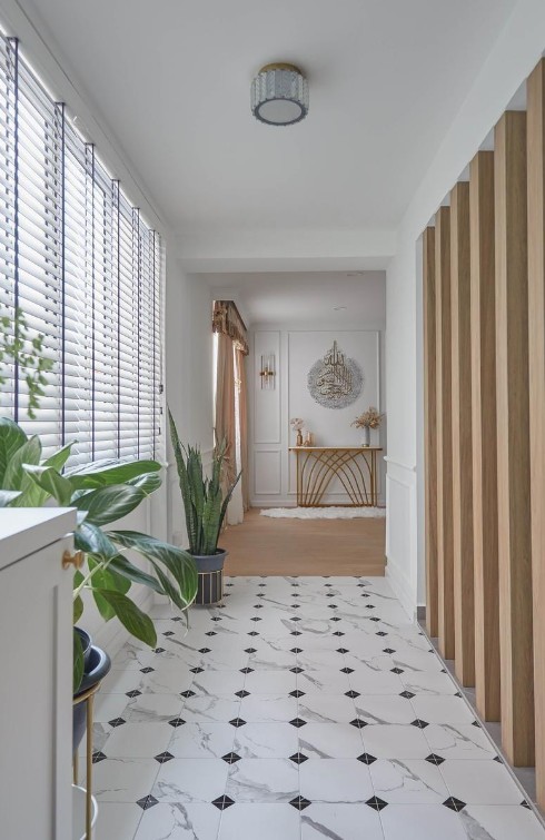 玄關處有一道墻,直接放著自然看起來是占地方,讓原本的玄關顯著更擁擠。因此,適當的留空,可以從根本上改善,還能將這道墻,裝成我們需要的功能區(qū)。