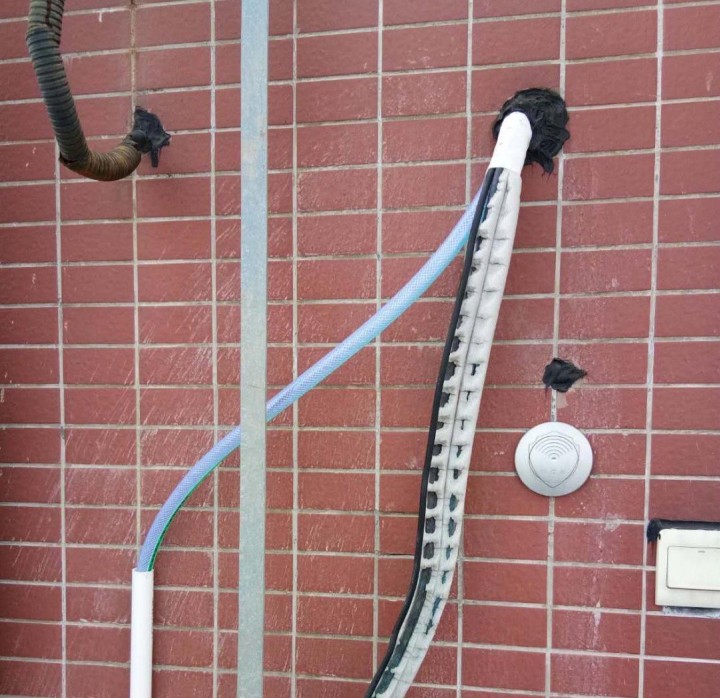 ②彎折,高層用戶常見的問(wèn)題就是彎折。正常情況下,冷凝水管應(yīng)該插在室外預(yù)留的排水管里。但高層風(fēng)比較大,很容易把管道吹出來(lái),進(jìn)而產(chǎn)生彎折,導(dǎo)致積水無(wú)法排出。遇到不好固定的情況,可以利用繩子等工具把水管綁住。