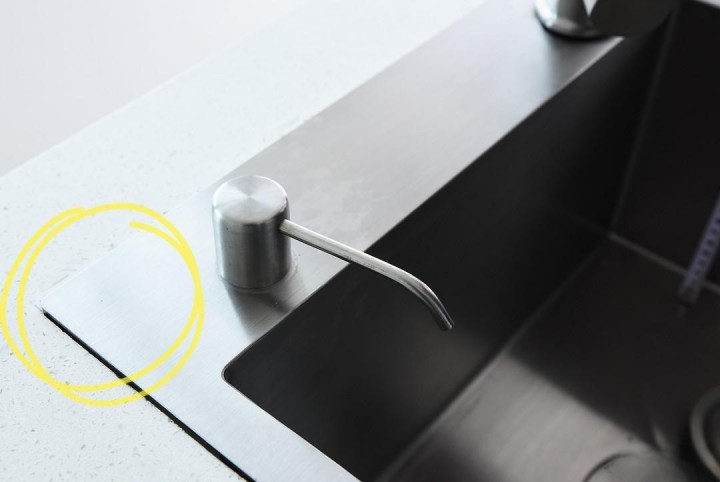 很多人喜歡臺中盆,水槽邊緣和臺面處于同一平面??雌饋硭坪醪诲e,但對工人的技術(shù)要求很高:安裝時需要在臺面上開槽,槽不能太深、太淺,也不能太寬、太窄,要剛好把邊緣嵌在里面才能做出網(wǎng)圖中的效果。