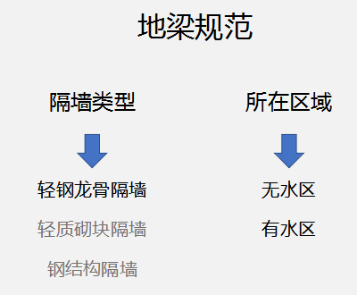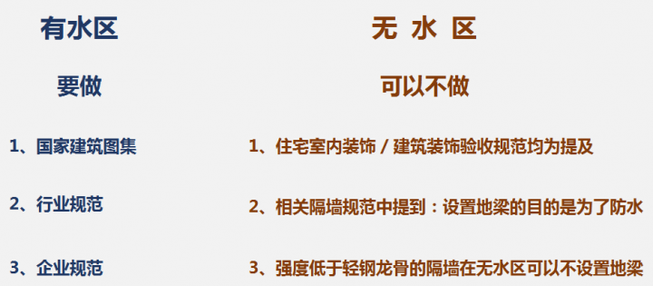 我們最后來整理下現(xiàn)在的資料。輕鋼龍骨隔墻,在有水區(qū)要做地梁,而無水區(qū),可以不做。