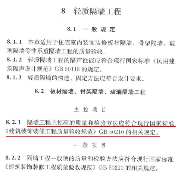 那我們先看《住宅室內(nèi)驗(yàn)收規(guī)范》,在第8章提到了輕質(zhì)隔墻工程,我們來看下。第八章一共就這一頁,而有用的信息也就一條:隔墻工程的質(zhì)量和檢驗(yàn)方法,應(yīng)符合《建筑裝飾,裝修工程,質(zhì)量驗(yàn)收規(guī)范》的相關(guān)規(guī)定,也就是這一本。