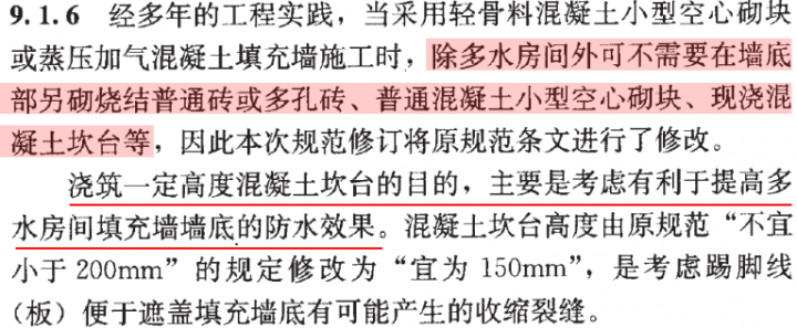 它的條文說明,這本必須執(zhí)行的國家規(guī)范倒為我們明確了設(shè)置地梁的目的。澆注一定高度混凝土坎臺的目的:主要是考慮有利于提高多水房間填充墻墻底的防水效果。