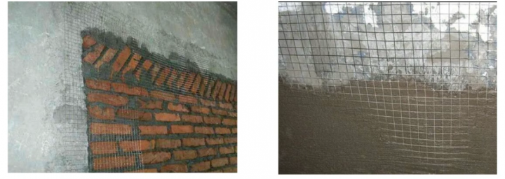 3.新舊墻面交界處,由于新舊墻體熱脹冷縮程度不同,熱傳遞不均勻會導致墻體開裂和變形,維修成本高,因此需要在交接處進行掛網鏈接。