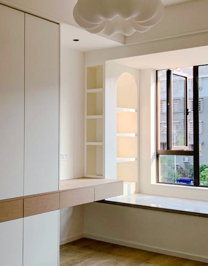 現在精裝房的大多數臥室都有飄窗,一般是贈送或半贈送的,它也是極易被忽視的小空間,雖然只有兩平米,但是不要小看,規劃好了可以增加翻倍的收納,變廢為寶,不要太劃算。