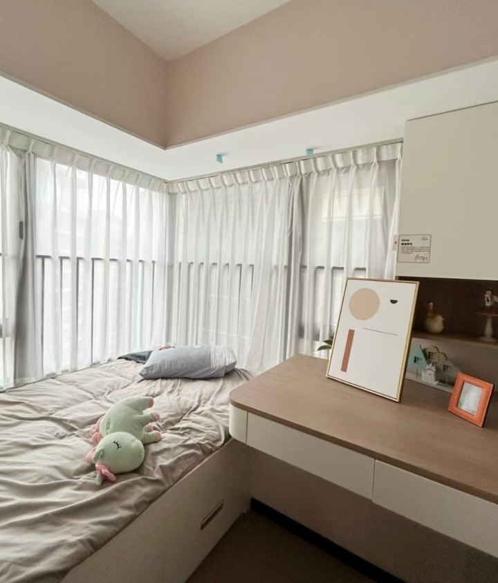 飄窗延伸做榻榻米:減少了床對地面的占用,小臥室也可以實現雙人床,還集合了書桌衣柜和大量儲物空間,可以說吧空間利用到極致。