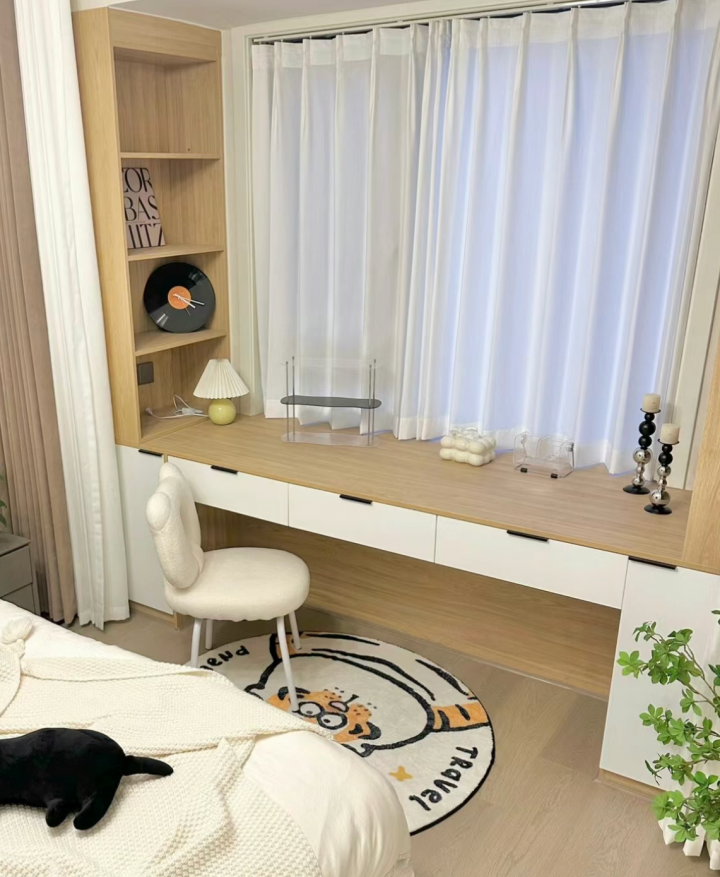 飄窗延伸做書桌:對于飄窗原本高度較低的臥室,可以在原有的基礎上,增加一整排抽屜用來儲物。